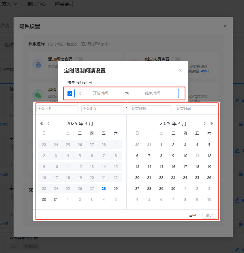 設置開啟日期時間和結束日期時間,在設置的這段時間內,書本可以正常閱讀。