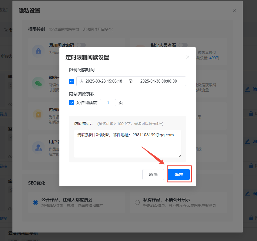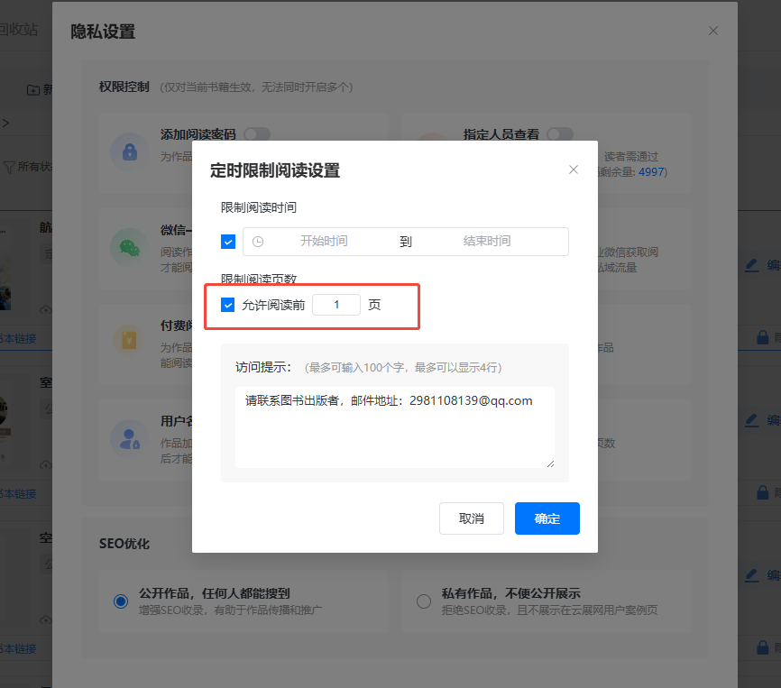 如果想要非限定的時間段內讀者可以試看,可以設置允許閱讀前幾頁。