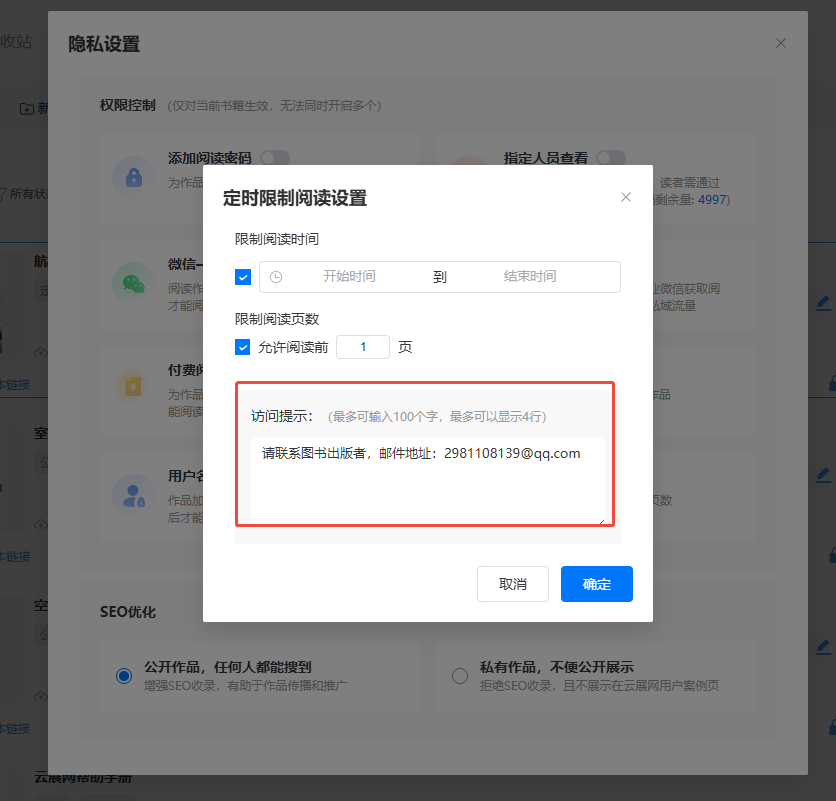 可根據你的需要,設置提示信息。比如你想讀者在無法閱讀的時候,能夠通過提示信息及時聯系到你,那你可在信息提示里輸入自己的郵箱地址。