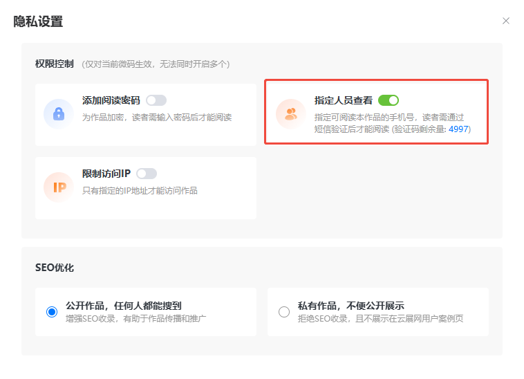 此功能可以后臺給微碼設置指定的手機號,然后讀者打開微碼后,需要通過指定的手機號收發驗證碼驗證后才可以觀看。