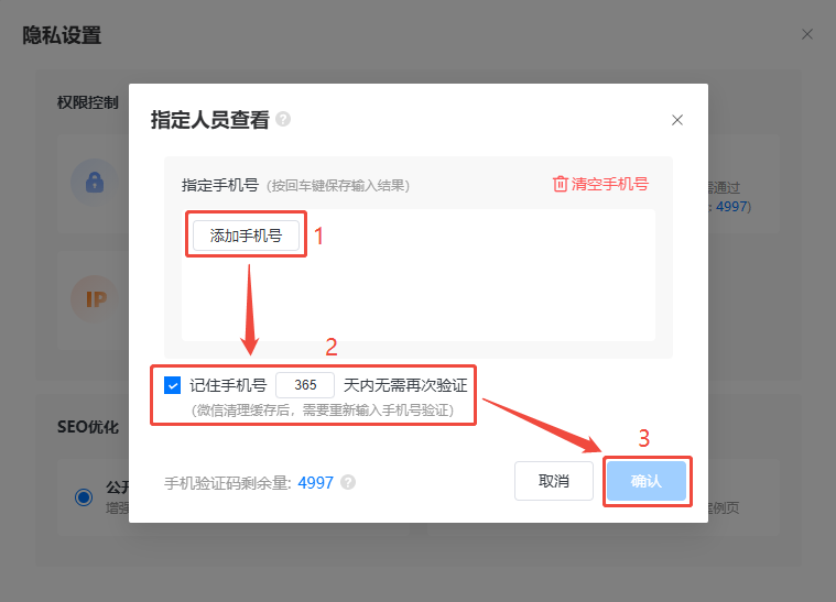 點擊【添加手機號】輸入一個或者多個手機號,如果您希望讀者在設定的時間段內再次訪問時無需再驗證,還可以選擇勾選下方的【記住密碼】,并設置間隔時間,最后點擊【確認】。