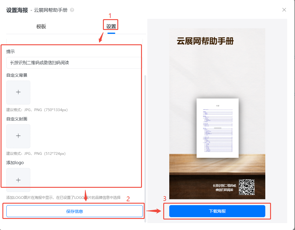 如何生成電子書海報? 一、功能介紹 海報,也是向讀者宣傳電子書內容的一種有效方式,通過海報,讀者可以先了解一下基本情況,再掃碼查看書本內容,讀者也可以分享海報給其他朋友,有利于深度宣傳。 二、操作步驟 1、生成海報 點擊【文檔】,然后點擊對應電子書的右邊三個點,再點擊【推廣】,最后點擊【生成海報】。 2、選擇海報模板 選擇一個海報模板。 3、編輯海報信息 點擊【設置】,下方輸入海報信息,點擊【保存信息】即可保存,最后點擊右側【下載海報】即可下載下來。