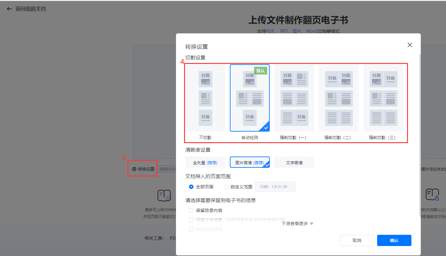 自動檢測:如果您上傳的文檔是封面封底為單頁,內頁為雙頁,選擇自動檢測切割雙頁