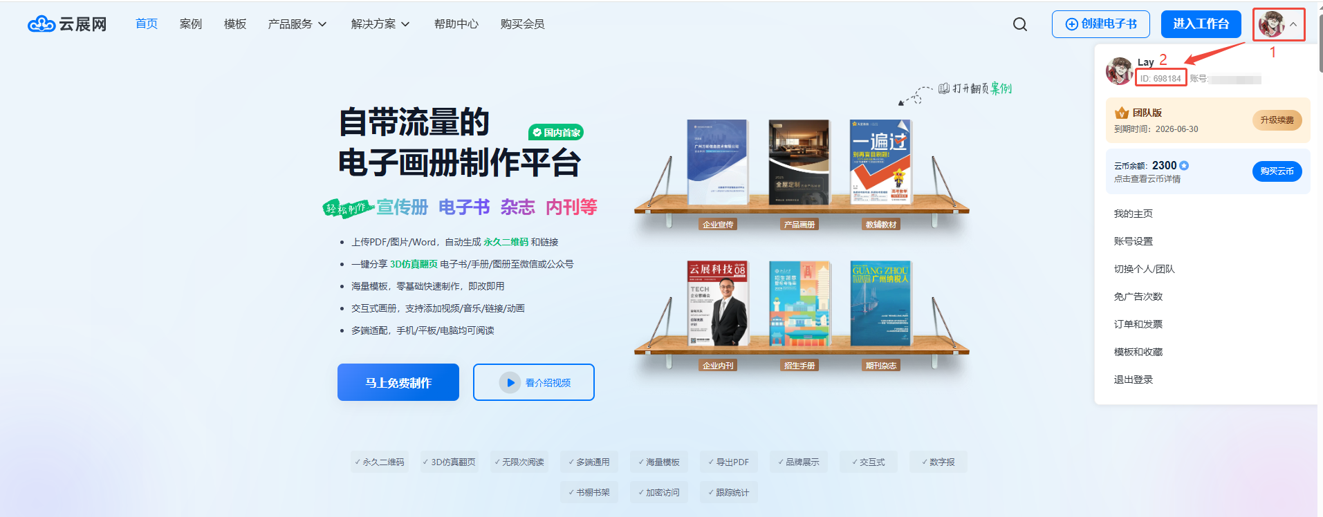 如何找到您的用戶ID? 一、簡介 用戶id是賬號的唯一不變的標識。 二、解決方案 1、登錄 云展網官網網址:www.bfog.com.cn,將云展網官網網址復制到瀏覽器打開,并登錄。 2、查看用戶ID 登錄賬號后,點擊右上角頭像即可查看用戶id。