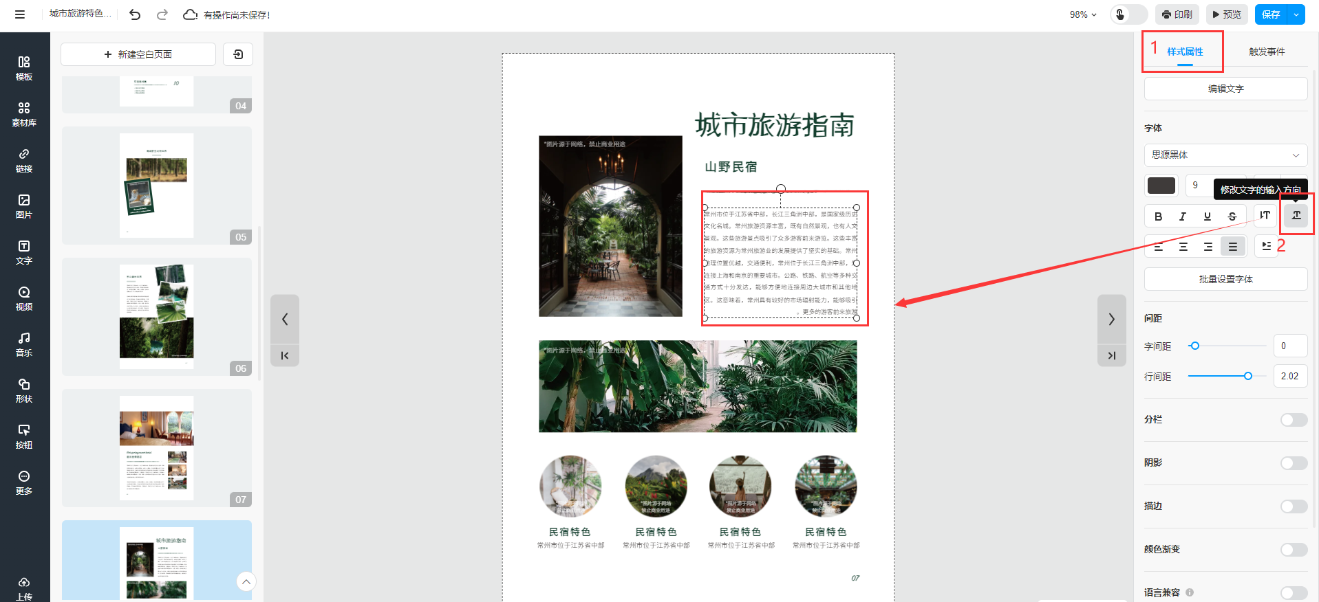 選中文本內容進入【樣式屬性】,點擊【修改文字的輸入方向】即完成。