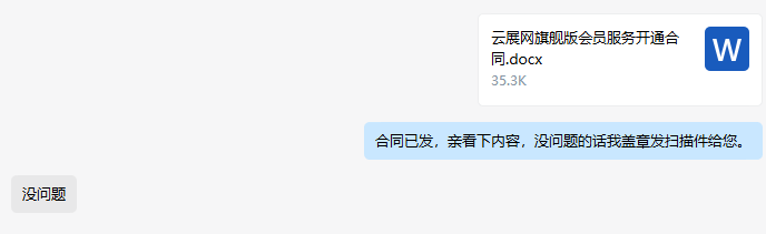 關于合同 一、簡介 購買云展網的付費會員都是可以簽訂合同的,只需添加客服微信,提供資料,客服即可生成合同。 二、解決方案 1、添加客服微信 在官網的右側有客服微信二維碼,微信掃一掃即可添加,并且表示需要簽訂合同。 2、提供資料 加上客服后,向客服提供甲方單位名稱, 注冊電話, 地址跟郵編,郵編沒有的話可以空著。 3、確認合同 客服生成合同后,會將生成的合同發給甲方確認,如甲方確認合同沒問題,客服會打印蓋章發掃描件給甲方。