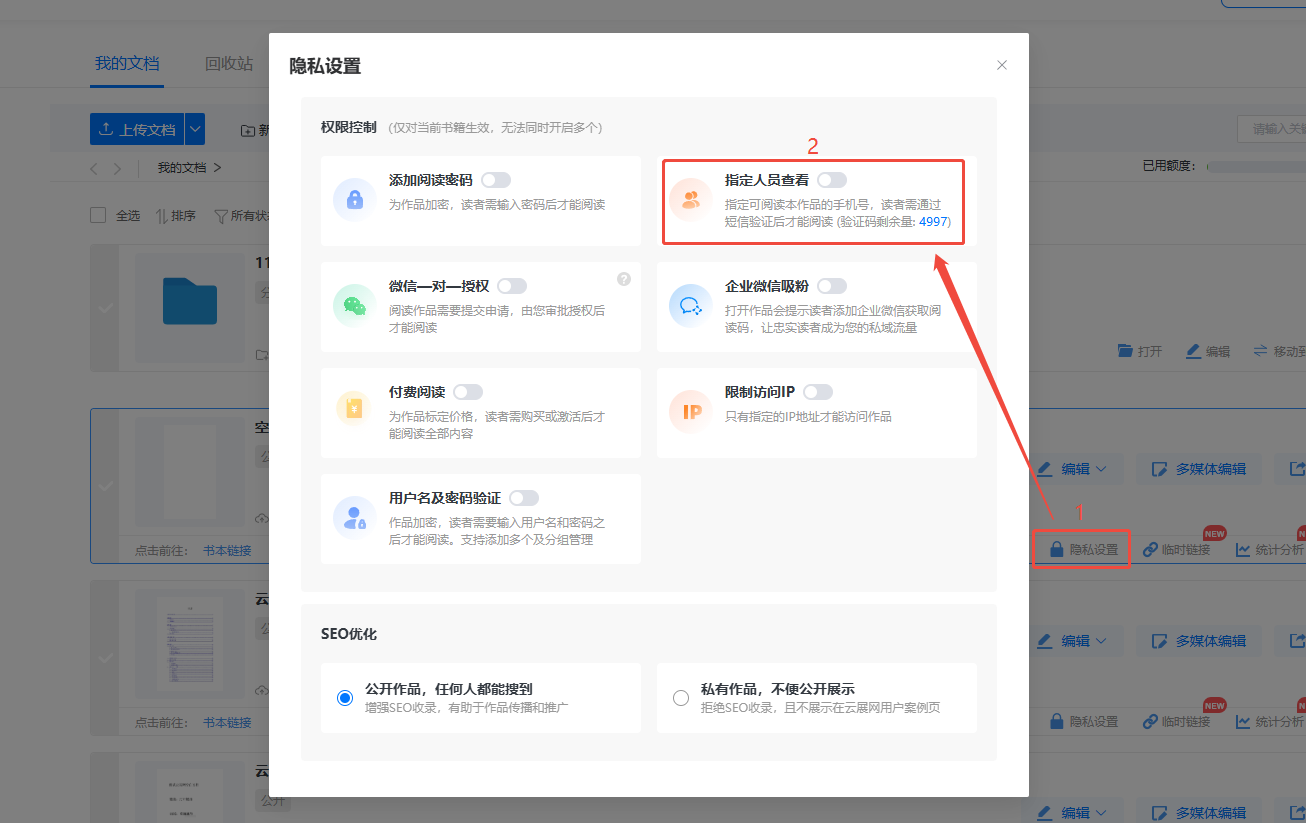 找到需要設(shè)置指定人員查看的電子書(shū),點(diǎn)擊【隱私設(shè)置】。開(kāi)啟【指定人員查看】選項(xiàng)。