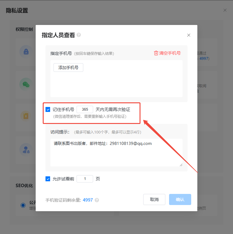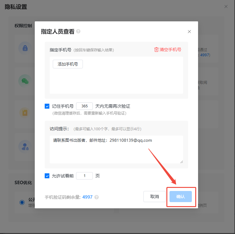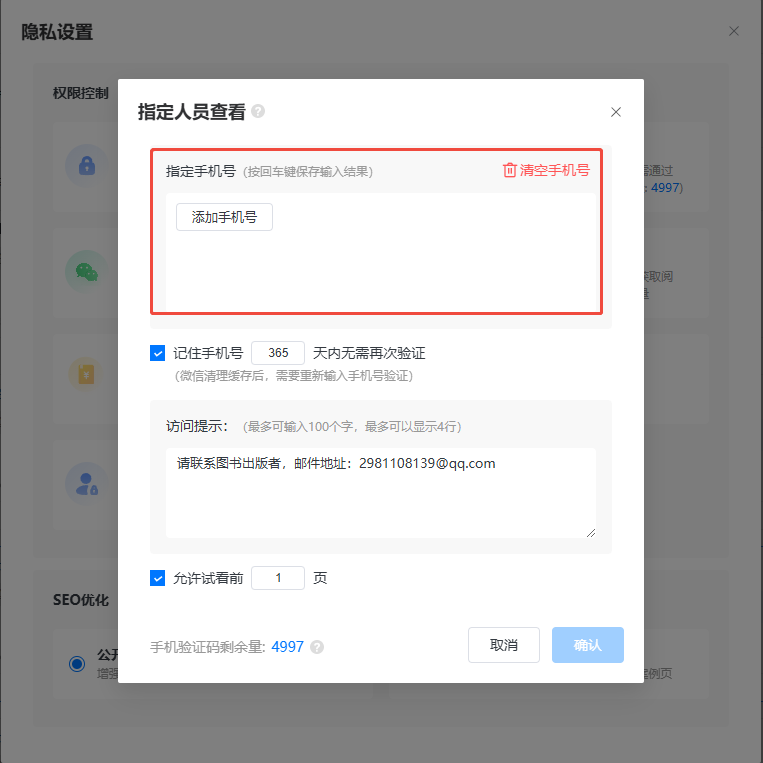如果你想允許讀者看幾頁(yè)之后再要求輸入手機(jī)號(hào)驗(yàn)證,可設(shè)置一下允許查看幾頁(yè)。