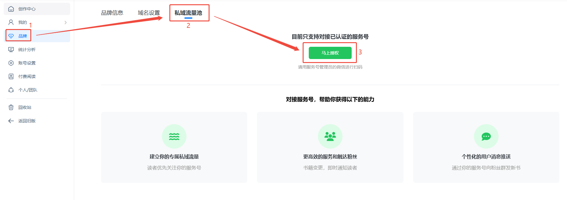 (1)點擊【品牌】,然后點擊【私域流量池】,點擊【馬上授權】。