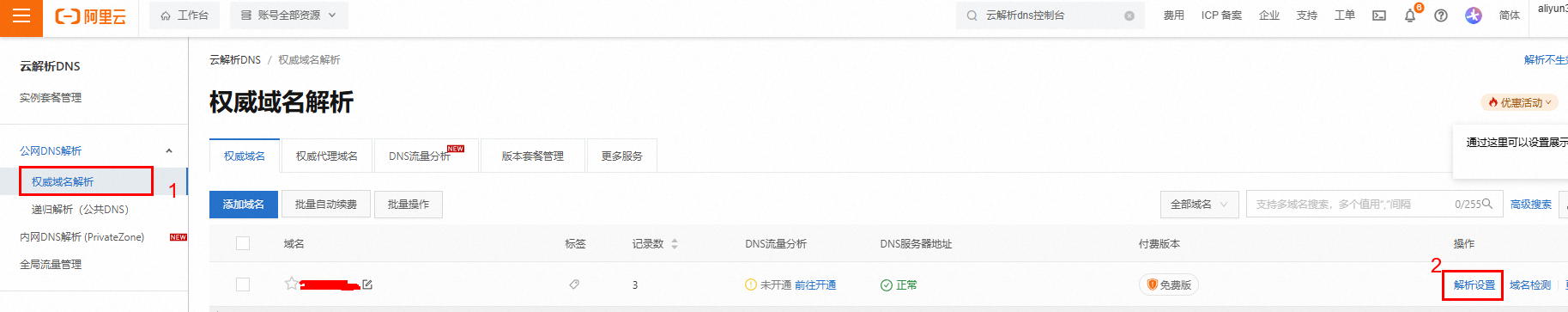 1)登錄阿里云網站,打開云解析DNS控制臺