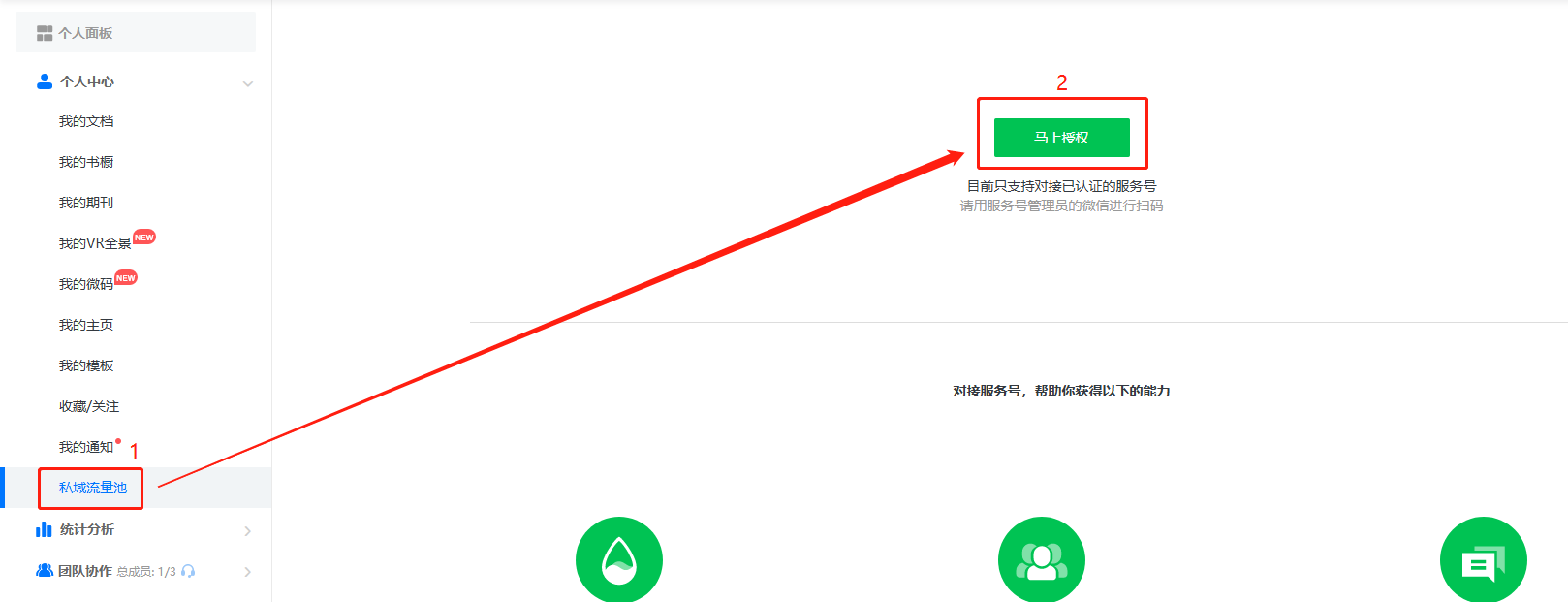 點擊私域流量池,再點擊馬上授權,使用公眾平臺綁定的管理員個人微信號掃描二維碼進行授權。