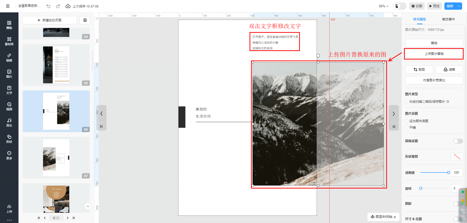 雙擊文字或者圖片框,對文字進行修改或者替換圖片。