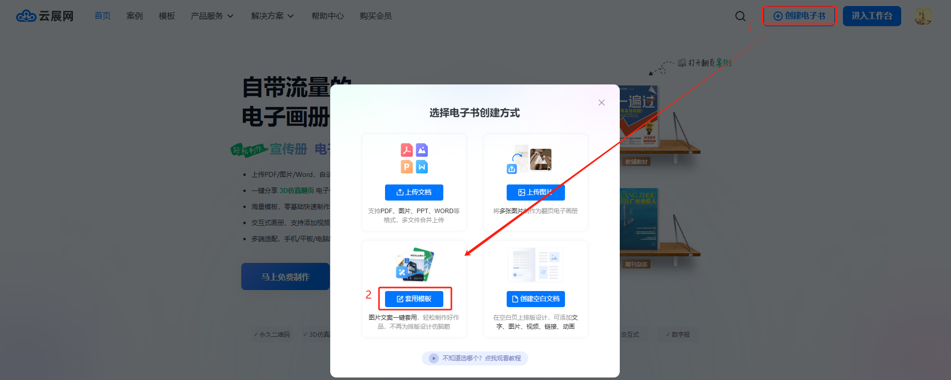 點擊右上角【創建電子書】,然后點擊【套用模板】,進入模板中心。