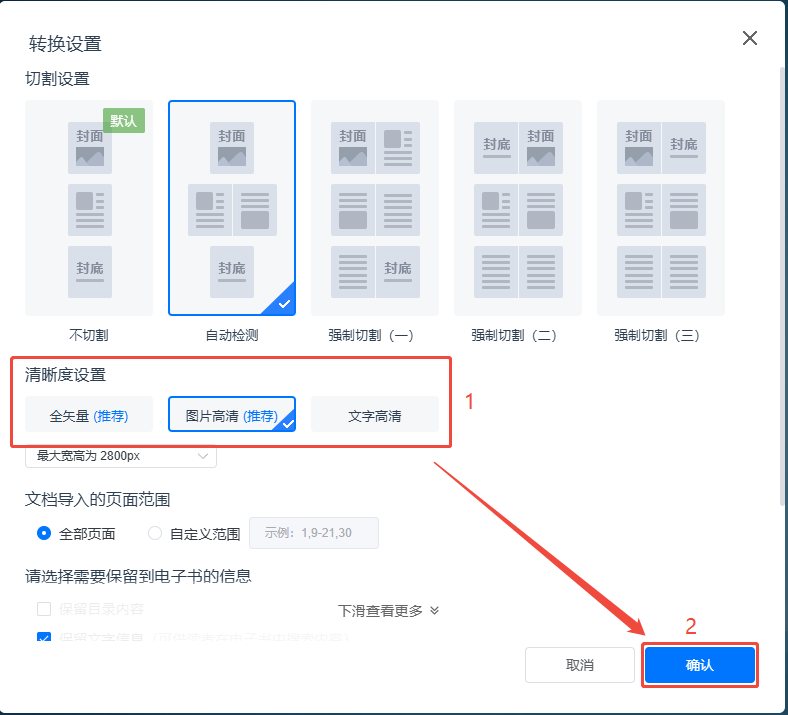 如果遇到上傳轉(zhuǎn)換慢/部分文字不顯示/不清晰的狀況,可以嘗試切換清晰度類型。