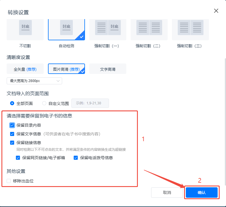 根據(jù)自身需要,勾選需要保留的信息即可,如果上傳的PDF上有出血位可以勾選【移除出血位】,點擊【確認(rèn)】即可。