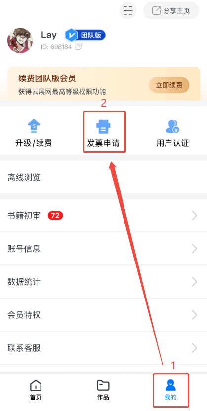 打開云展app,點擊【我的】,點擊【發票申請】進入申請頁面。