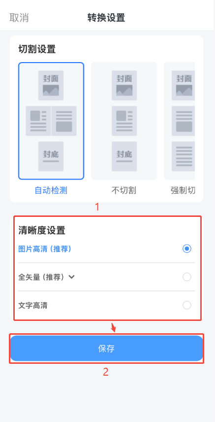 點擊右上角【轉(zhuǎn)換設(shè)置】,然后在【清晰度設(shè)置】選擇合適的清晰度類型后,點擊【保存】即可。