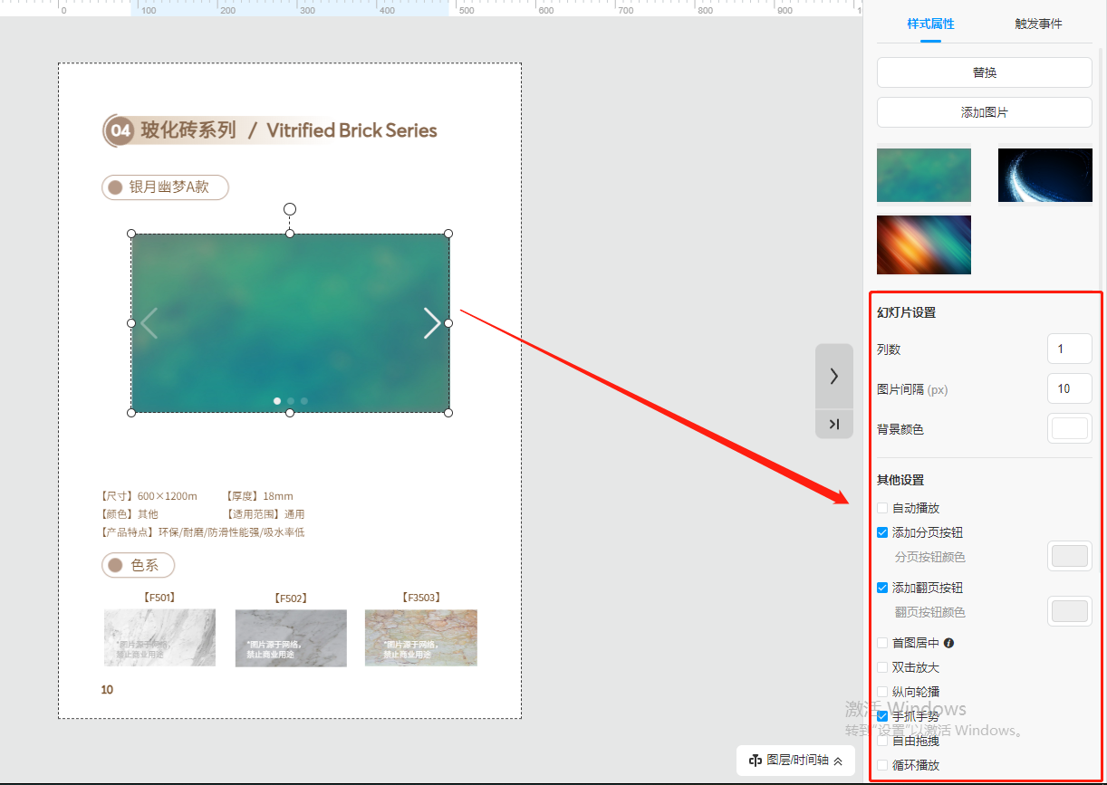 點擊【更多】,選擇【幻燈片】,挑選一個幻燈片的樣式,頁面會出現(xiàn)一個幻燈片組件