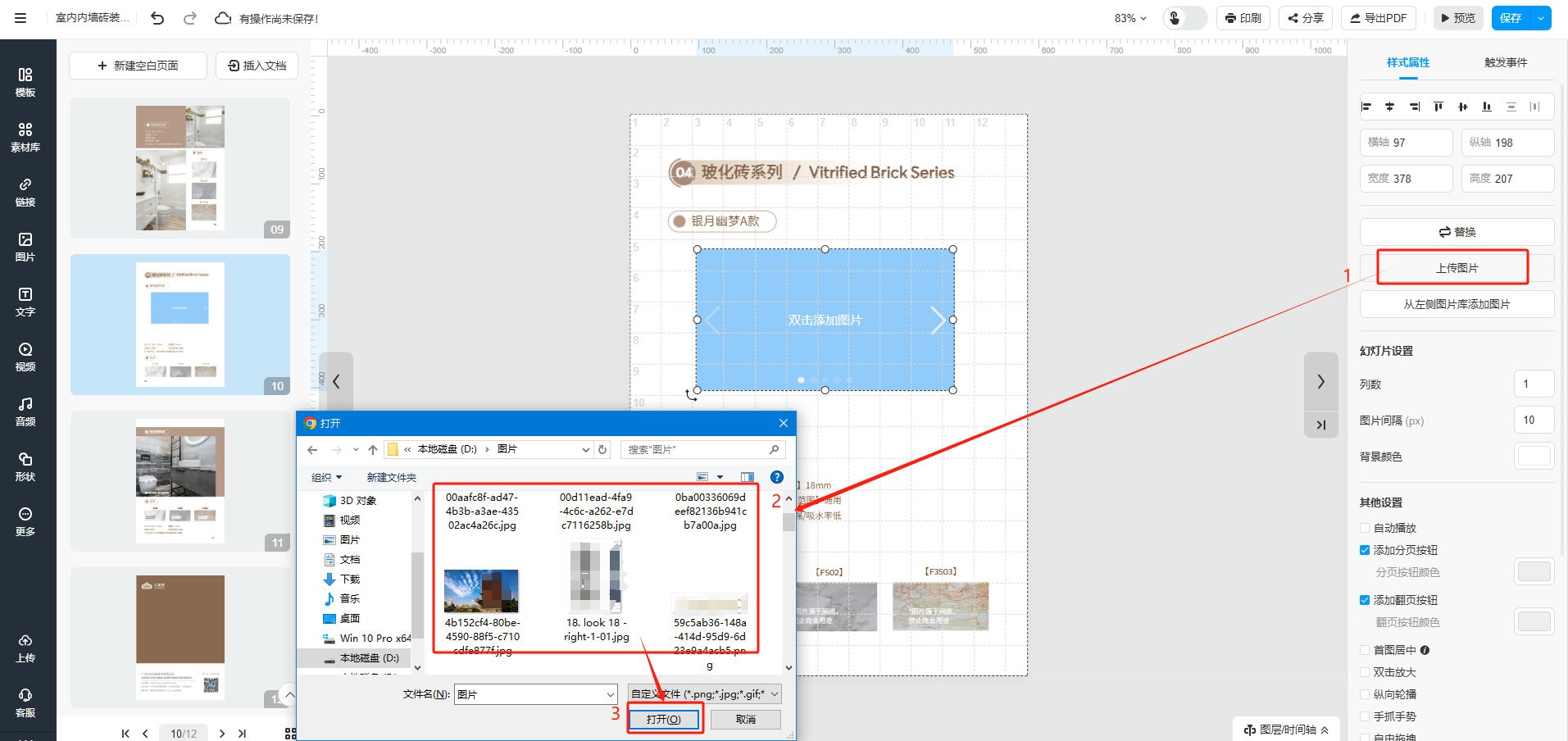 點擊【上傳圖片】,選擇圖片后,點擊【打開】,將圖片添加到幻燈片中