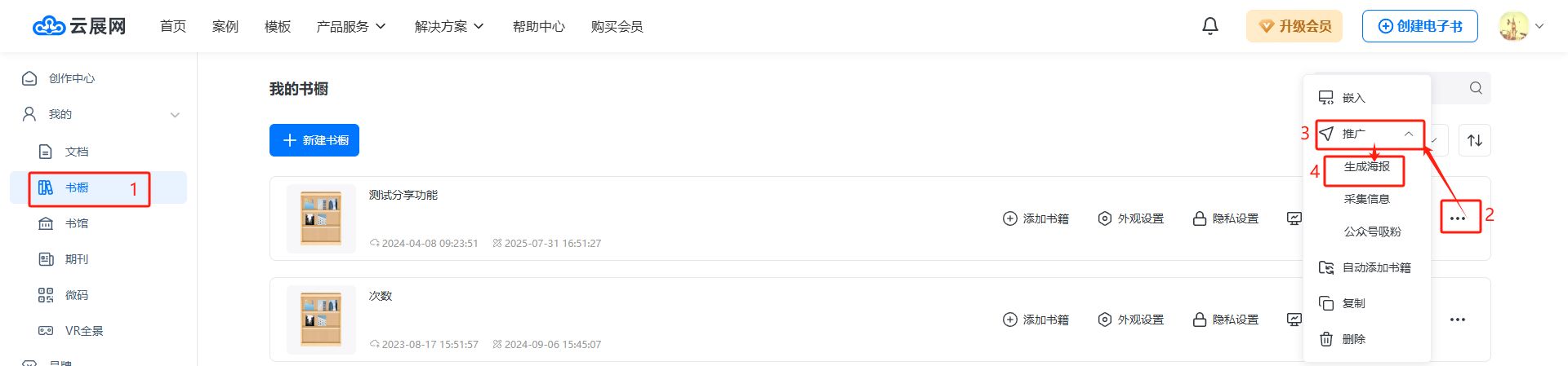 在【書(shū)櫥】頁(yè)面,點(diǎn)擊右邊三個(gè)點(diǎn),隨后點(diǎn)擊【推廣】,點(diǎn)擊【生成海報(bào)】。