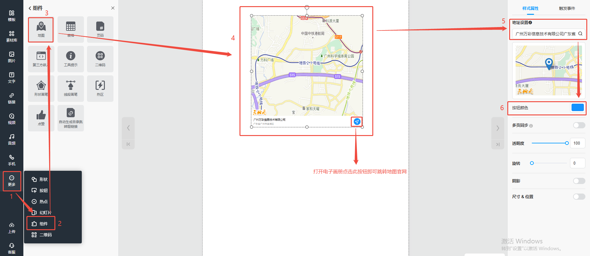 點擊【更多】,選擇【組件】,然后點擊【地圖】,在頁面上就會出現一個地圖板塊,在右側【地址設置】輸入目的地,設置【按鈕顏色】即可。