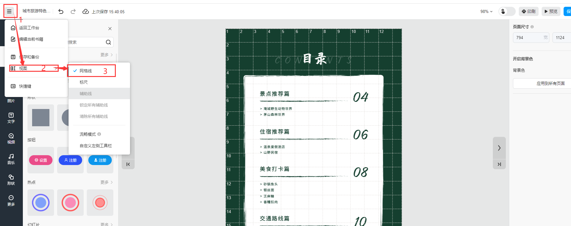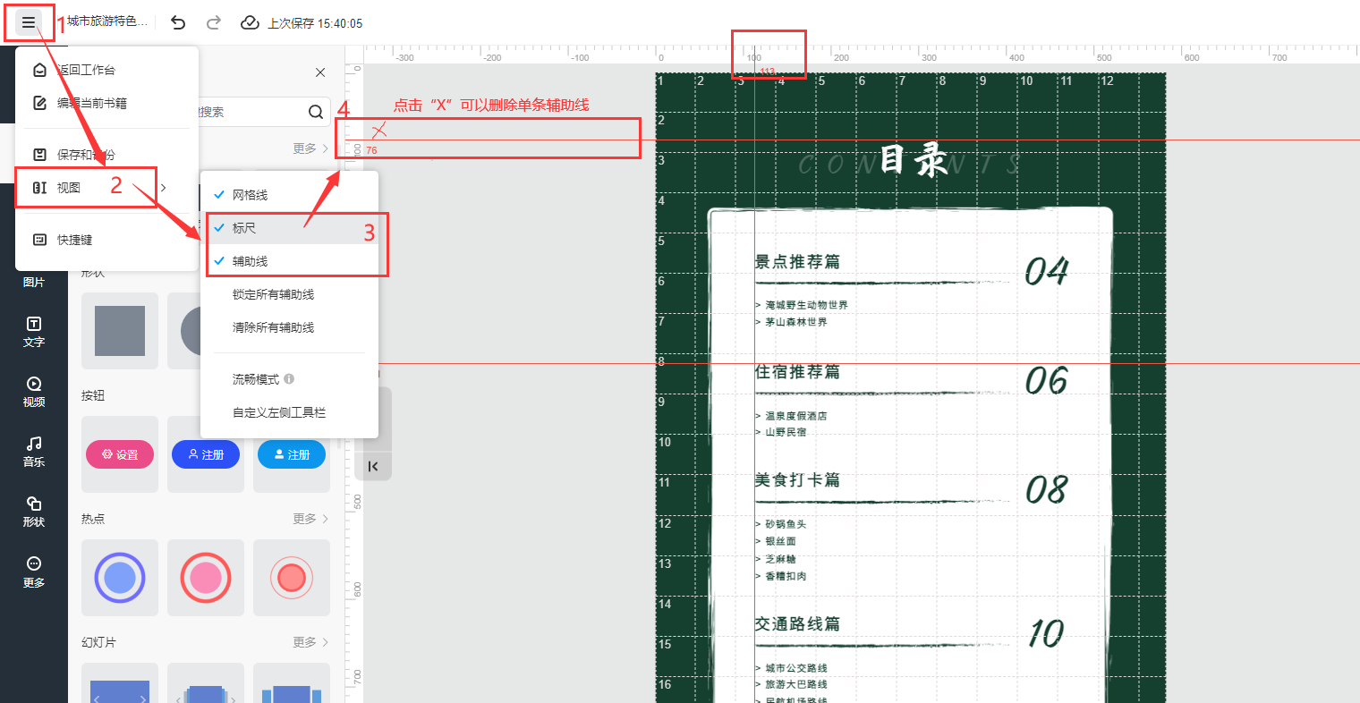 點(diǎn)擊左上角的【三橫杠圖標(biāo)】,點(diǎn)擊【視圖】,勾選【標(biāo)尺】和【輔助線】,點(diǎn)擊標(biāo)尺刻度,可以在頁面添加一條輔助線幫助排版,但是打開書本鏈接查看不會出現(xiàn)添加的輔助線