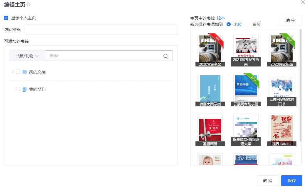 2、彈出編輯窗口后,點擊文件夾,勾選需要展示的書籍并保存,設置私有的雜志將不會展示在主頁。