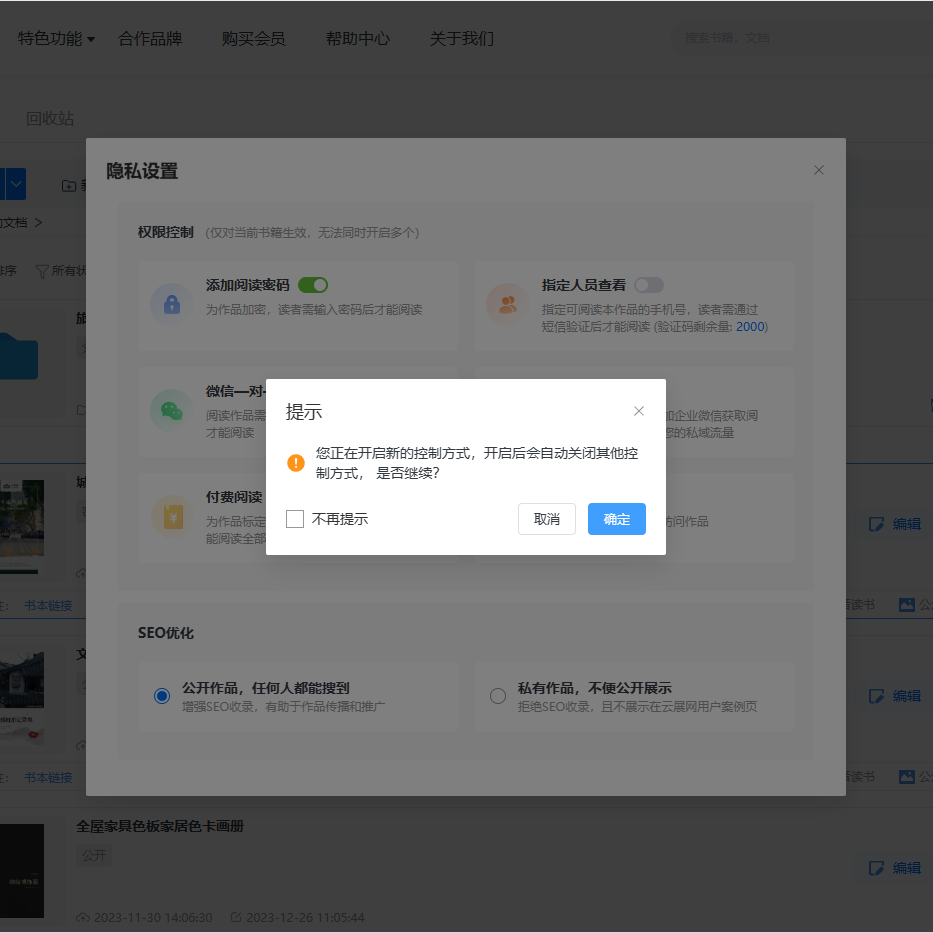 找到你需要設(shè)置限制訪問(wèn)IP的電子書(shū),點(diǎn)擊【隱私設(shè)置】,勾選【限制訪問(wèn)IP】彈出彈窗后,添加IP地址,并根據(jù)你的需要設(shè)置提示信息,最后點(diǎn)擊【確認(rèn)】即可。