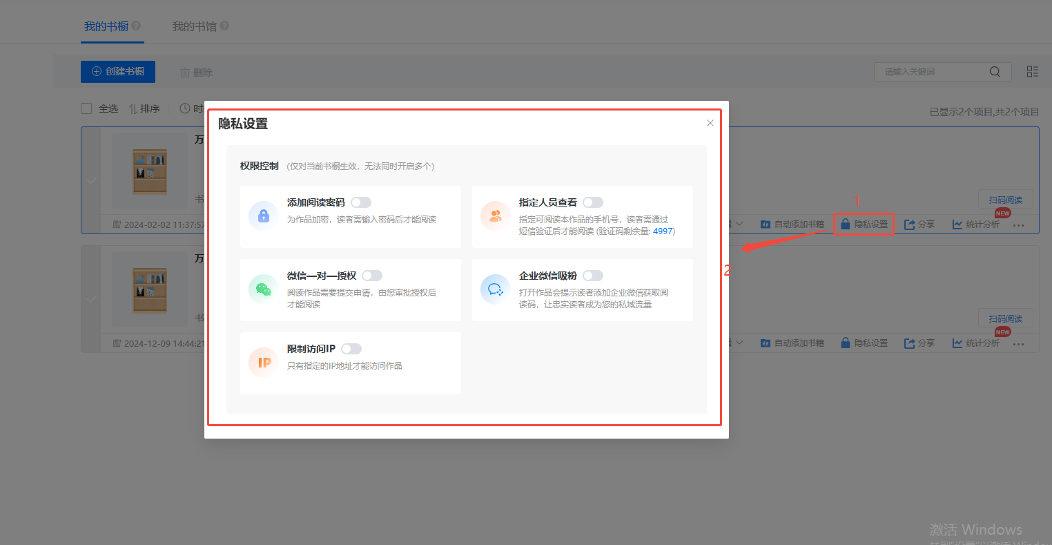 找到要設置的書櫥,點擊【隱私設置】進行設置,根據你的需要選擇隱私設置方式。