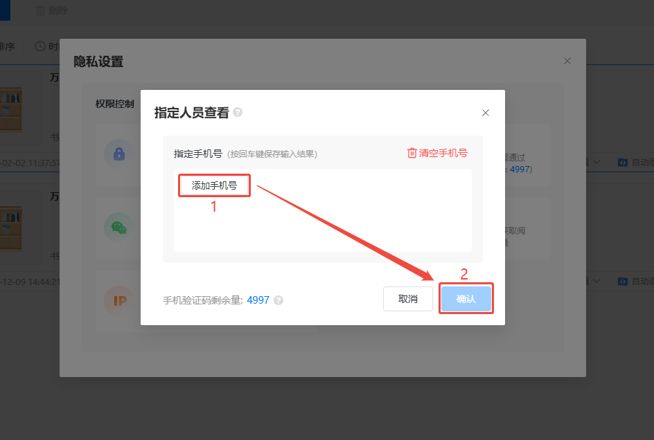 勾選【指定人員查看】彈出彈窗,點擊【添加手機號】輸入手機號后點擊【確定】即可。