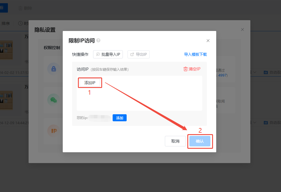 勾選【限制訪問IP】彈出彈窗,點擊【添加IP】輸入IP地址后點擊【確認】即可。