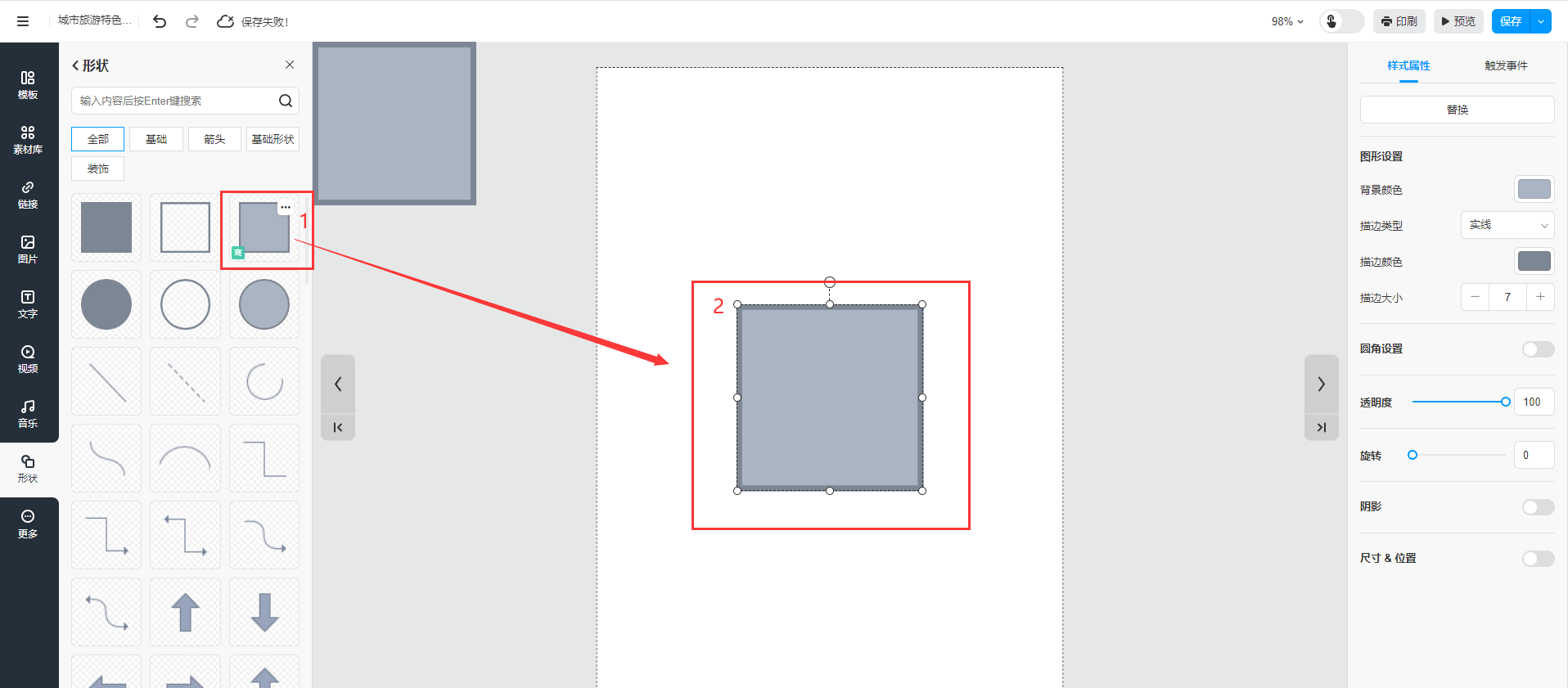 選中你想要設置樣式屬性的元素,在右側屬性面板可進行對齊、替換、動畫、顏色、透明度、陰影、尺寸和位置以及旋轉等設置。