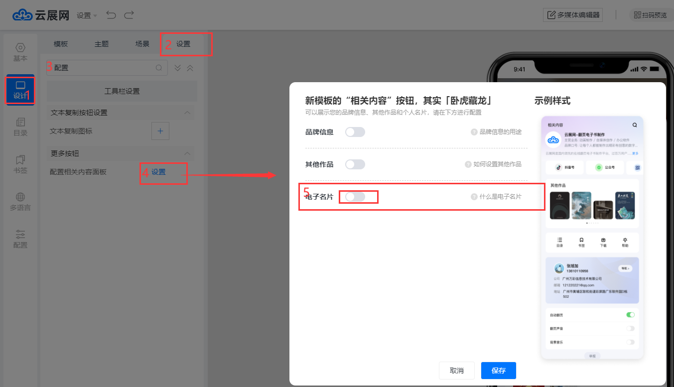 點(diǎn)擊【設(shè)計(jì)】,點(diǎn)擊【設(shè)置】,在搜索欄輸入”配置”關(guān)鍵字查找,點(diǎn)擊【配置相關(guān)內(nèi)容面板】設(shè)置,開啟電子名片功能