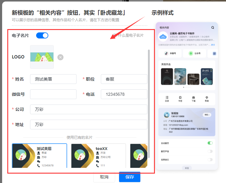 電子名片是指添加您的logo圖、姓名、職位、微信號(hào),電話等信息形成電子名片,展示在相關(guān)內(nèi)容面板上,可以快速地與潛在客戶建立聯(lián)系,提高溝通效率和響應(yīng)速度。