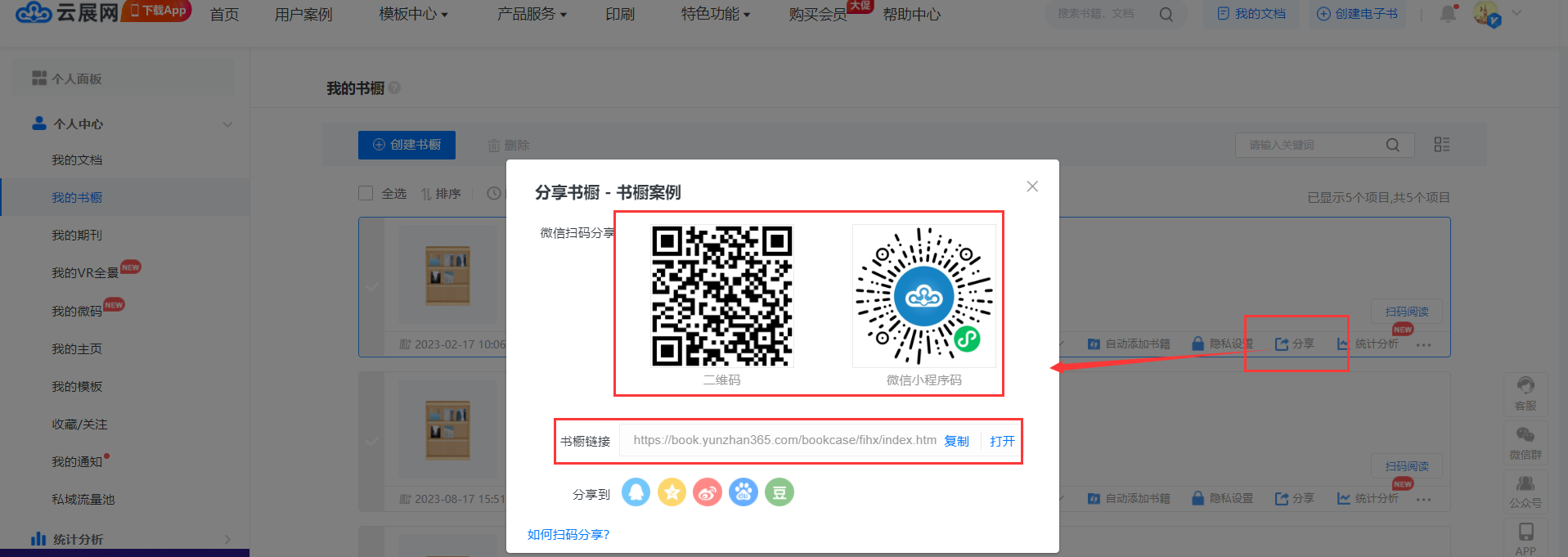 把文檔上傳到云展網后,在【我的文檔】中找到相應的電子書,如下圖操作就可以看到書籍的鏈接/二維碼和小程序碼