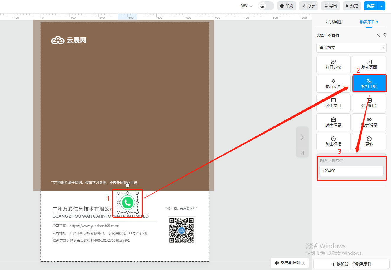 點(diǎn)擊頁(yè)面上的電話按鈕,在右邊界面屬性可以輸入希望讀者聯(lián)系的電話號(hào)碼。