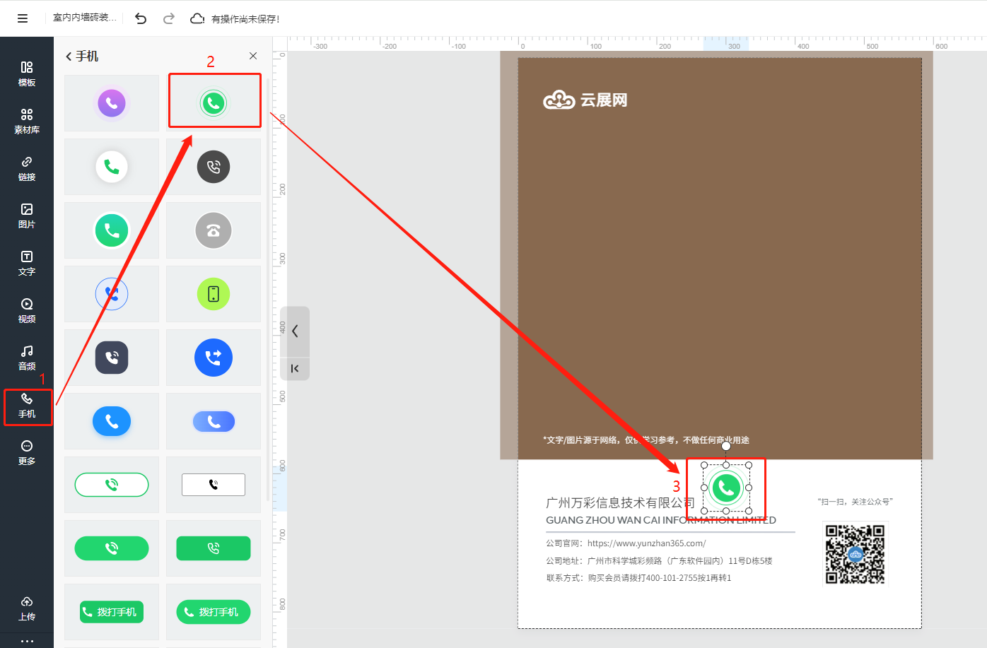 進(jìn)入多媒體編輯頁(yè)面后點(diǎn)擊【手機(jī)】,然后選擇按鈕樣式,就會(huì)有一個(gè)電話按鈕出現(xiàn)在頁(yè)面上。