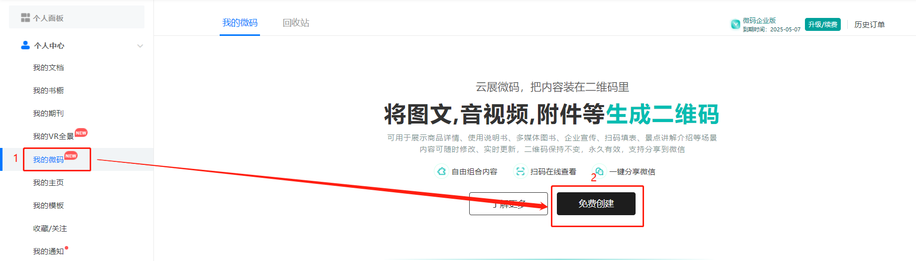 點(diǎn)擊【我的微碼】,然后點(diǎn)擊【免費(fèi)創(chuàng)建】。
