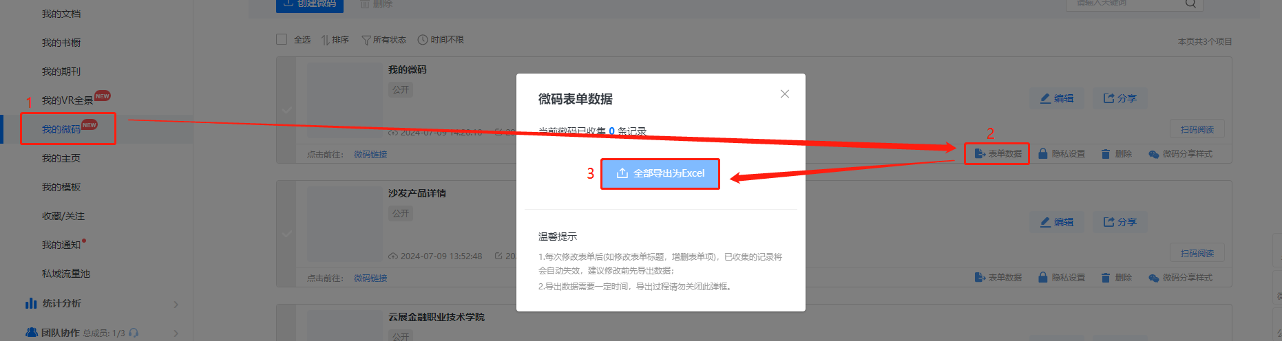 點擊【我的微碼】,然后點擊【表單數(shù)據(jù)】,最后點擊【全部導(dǎo)出為excel】,即可查看收集到的數(shù)據(jù)