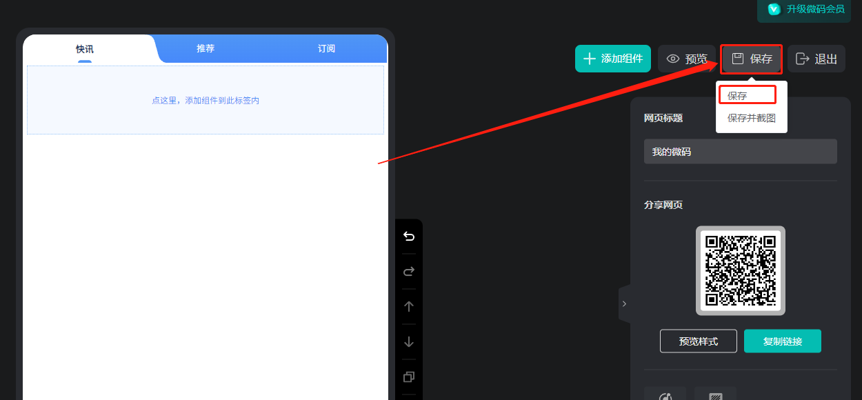 點擊【添加組件】,點擊【標簽頁】,在左邊選擇標簽樣式添加到微碼上。