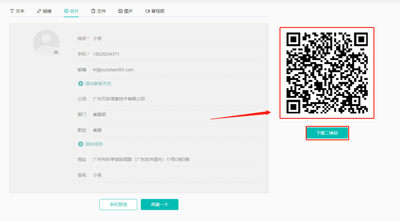 (1)點擊【名片】,下方輸入名片信息,點擊【生成二維碼】。