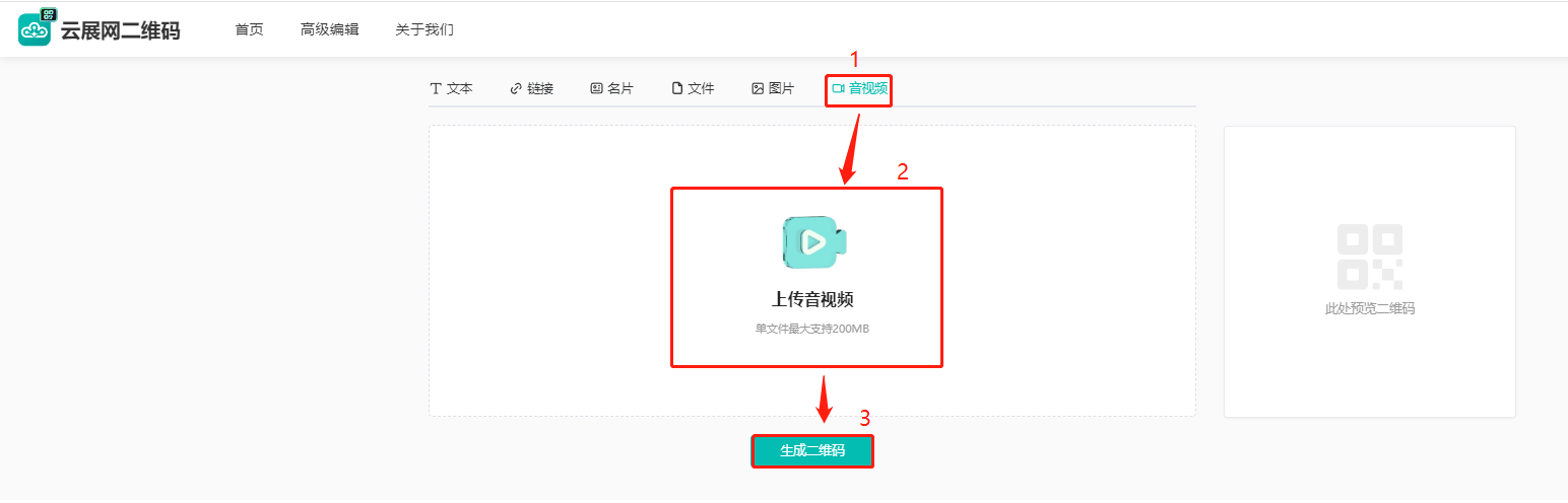 (1)點擊【音視頻】,然后點擊下方【上傳音視頻】上傳音頻或者視頻文件,點擊【生成二維碼】。